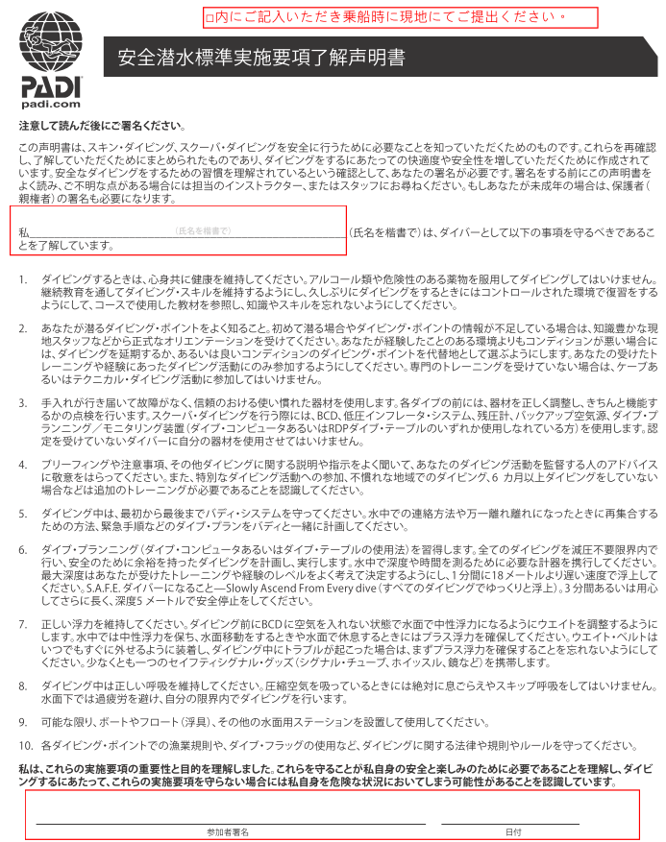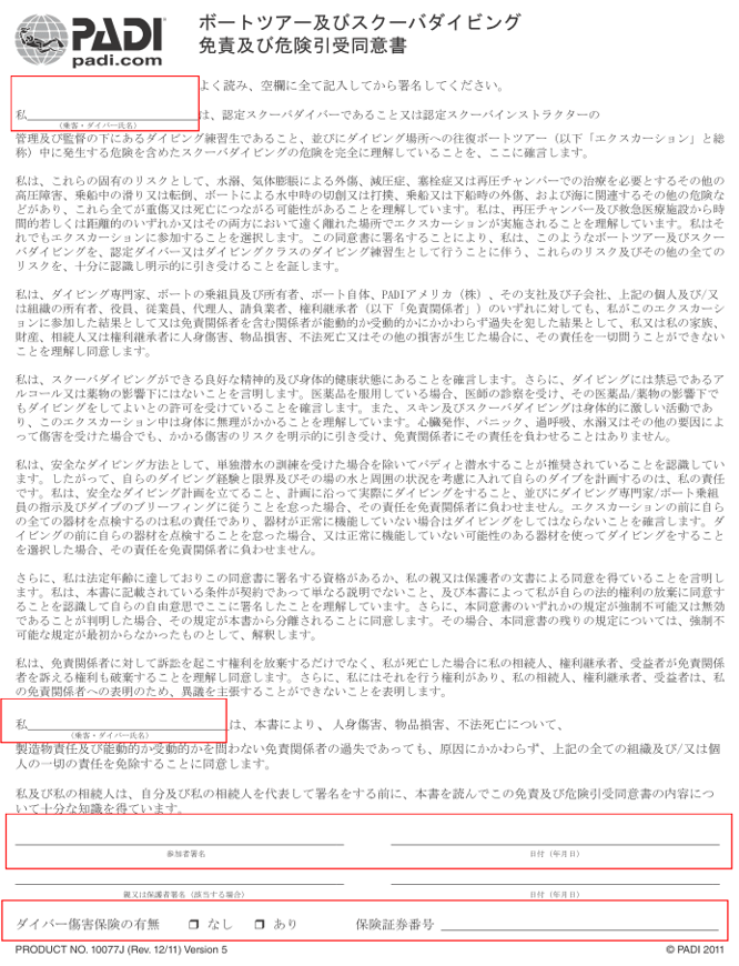 ■ボートツアー及びスクーバダイビング免責及び危険引受同意書
