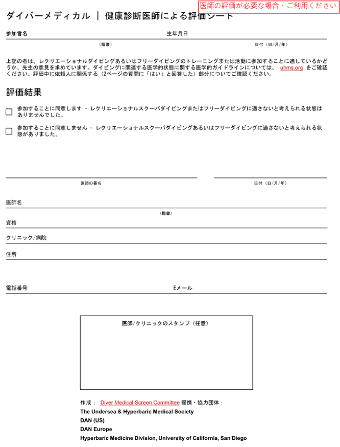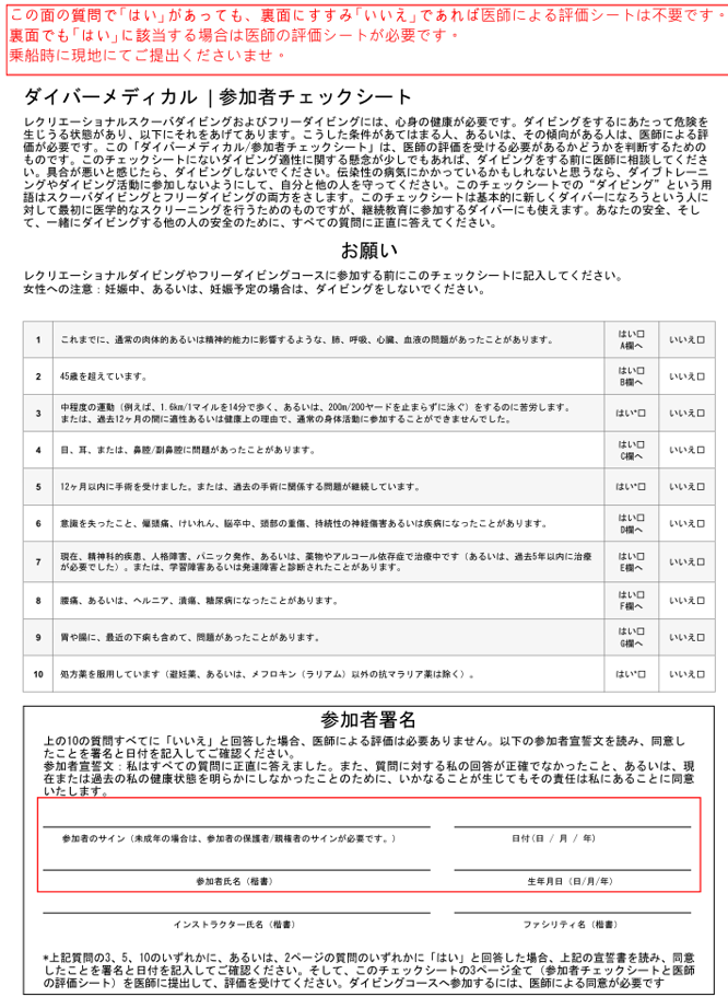 ご乗船いただく全てのお客様に、「ダイバーメディカル/参加者チェックシート」を事前にご提出いただいております。安全に楽しくダイビングをなさっていただくために、ご理解とご協力をお願い申し上げます。